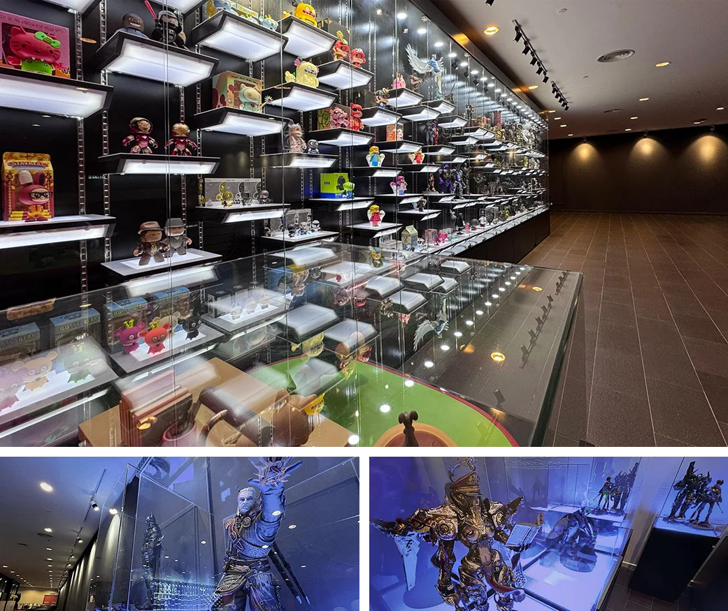 A striking display wall filled with collectible art toys serves as a hub of creativity. Showcasing inspiring packaging designs and IP creations, these displays transform the space into a dynamic gallery, sparking curiosity and artistic exploration among students.